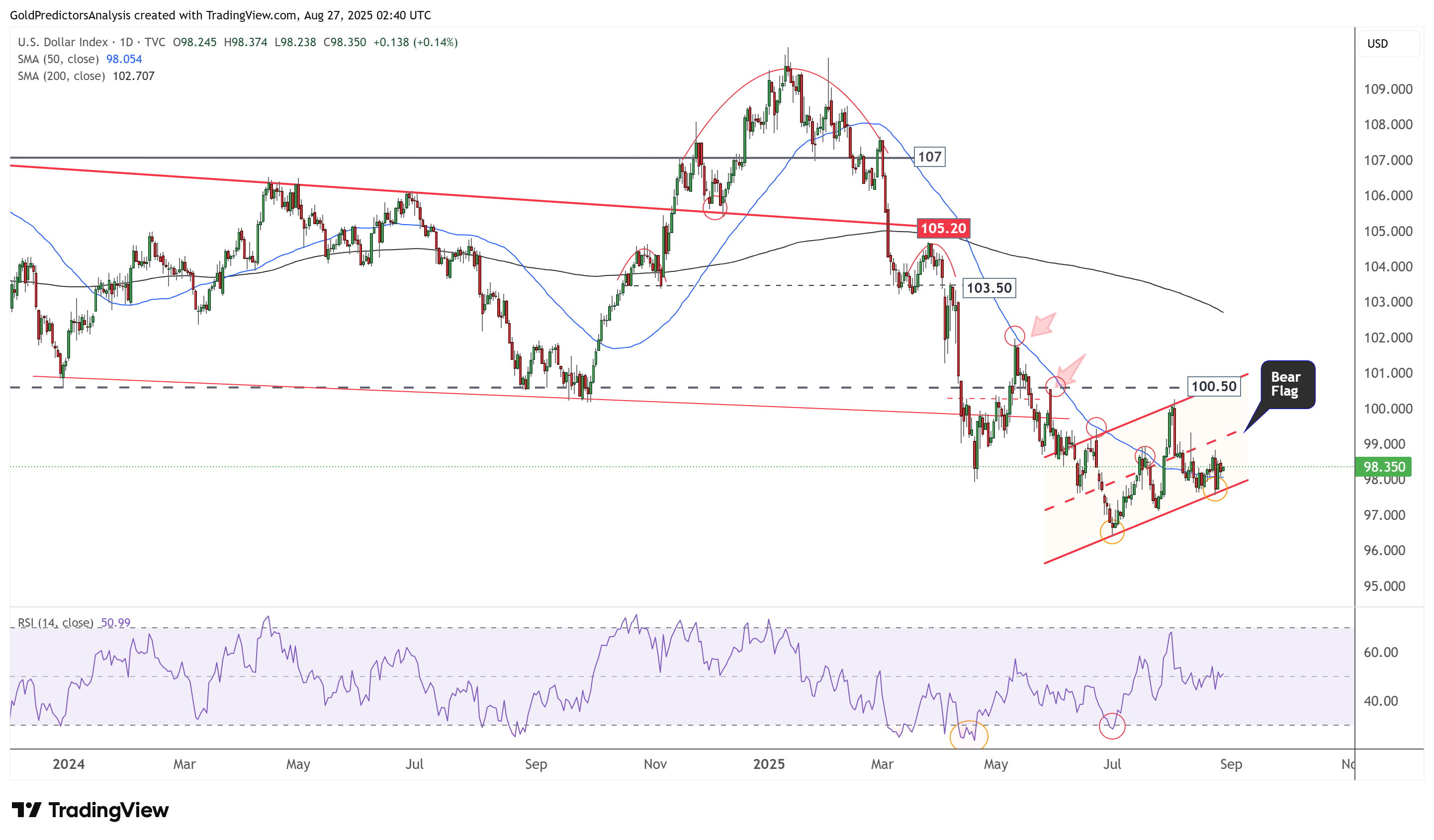 Chỉ số USD đang vận động trong mô hình cờ giảm giá, hình thành sau giai đoạn đi ngang từ tháng 7 đến tháng 8. Mô hình này thiên về xu hướng giảm, và việc xuyên thủng mốc 97 có thể kéo chỉ số giảm sâu về vùng 90.