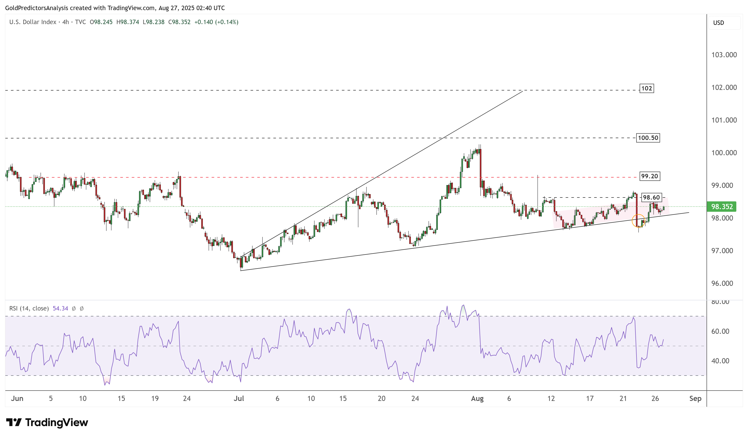 Khung 4 giờ cho thấy chỉ số hình thành mô hình nêm mở rộng tăng dần. Đợt phá vỡ sau bài phát biểu của Powell tại Jackson Hole hóa ra chỉ là “false breakout”. Hiện chỉ số đang dao động đi ngang trong vùng tích lũy và có khả năng phục hồi ngắn hạn. Tuy nhiên, một khi xuyên thủng mốc 97, xu hướng giảm sẽ được xác nhận và có thể kéo chỉ số về các mức thấp hơn.