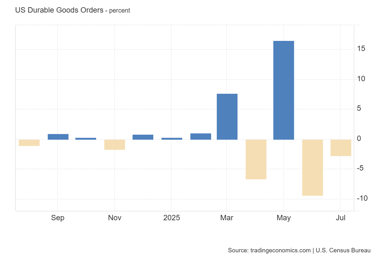 Ở chiều ngược lại, dữ liệu đơn hàng hàng hóa lâu bền tại Mỹ giảm 2.8% trong tháng 7, sau khi đã giảm mạnh 9,4% trong tháng 6. Dù con số này tốt hơn dự báo -4%, nhưng vẫn cho thấy nhu cầu suy yếu. Doanh nghiệp nhập khẩu sớm để tránh thuế mới đã khiến đơn hàng hiện tại giảm sút.