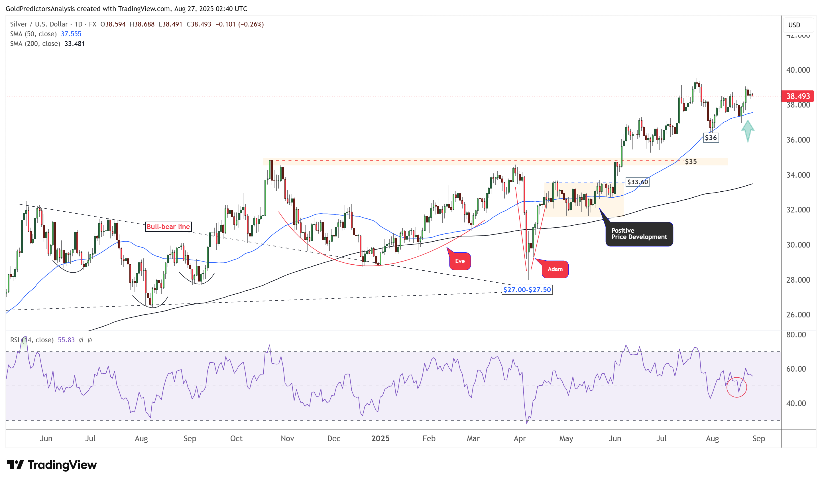 Biểu đồ ngày của bạc cho thấy SMA 50 ngày quanh $36 tiếp tục đóng vai trò hỗ trợ vững chắc. Mỗi lần giá chạm ngưỡng này, mô hình nến hammer tăng giá lại xuất hiện, cho thấy lực mua mạnh mẽ và động lượng đi lên. Một khi phá vỡ trên $40, bạc có thể hướng tới vùng $42–$43.