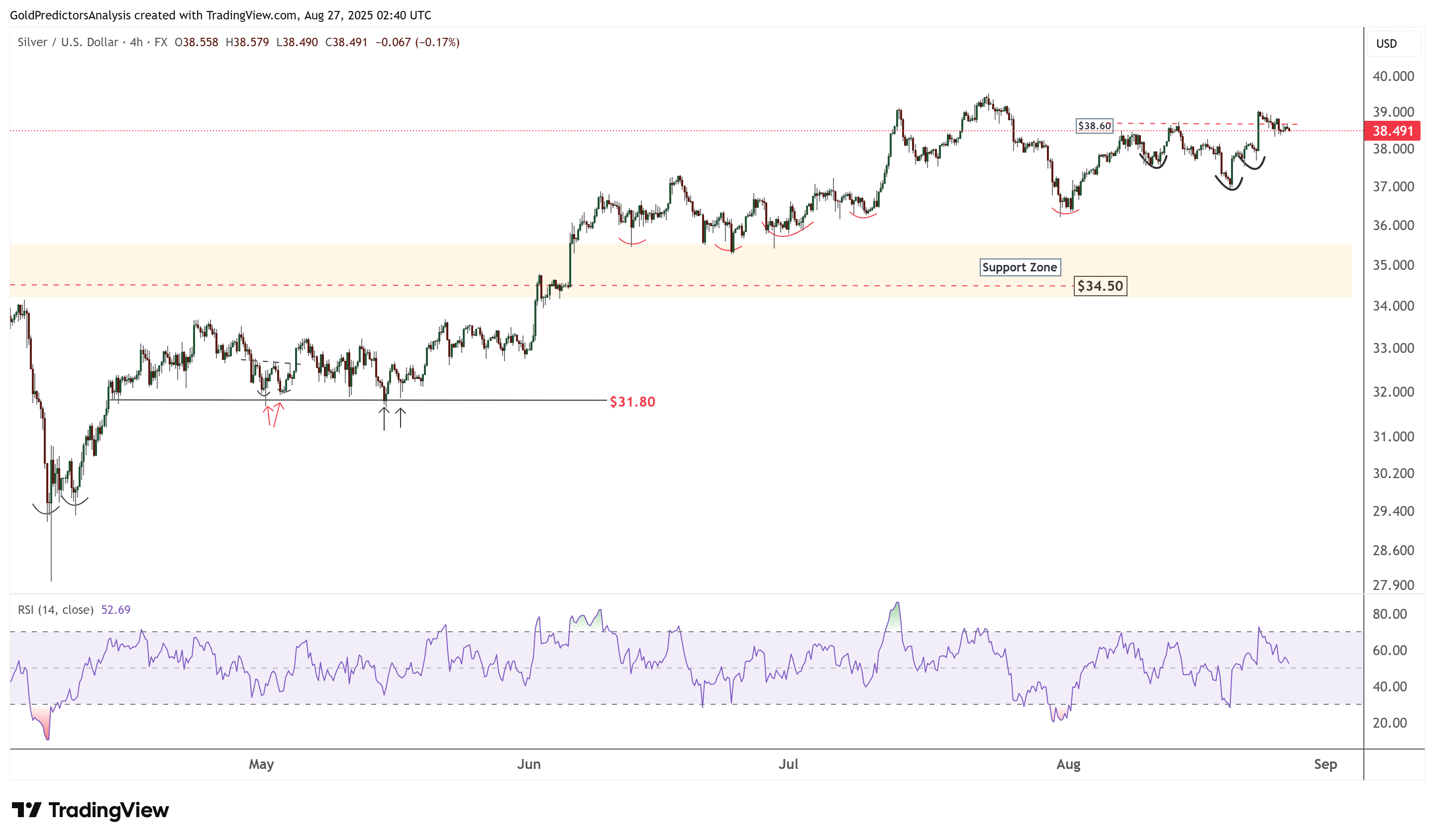 Trên khung 4 giờ, bạc giữ được đà tăng trên $31,80 và đã vượt mốc quan trọng $34,50, hiện biến mức này thành hỗ trợ. Cấu trúc giá củng cố xu hướng tăng, với mục tiêu tiếp theo là vùng $40. Một phá vỡ dứt khoát trên ngưỡng này sẽ mở đường cho giá tiến tới khu vực $43.