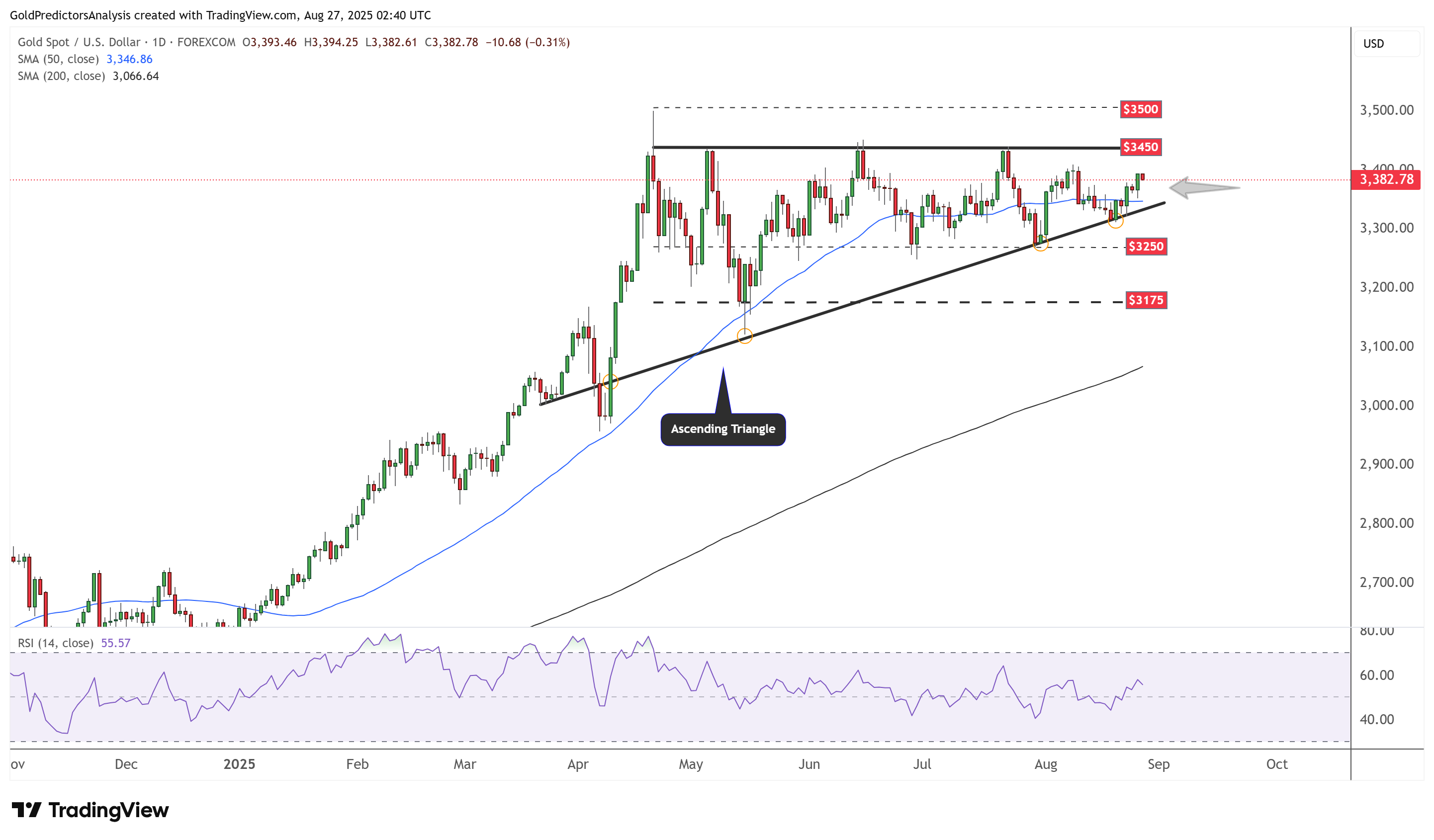 Biểu đồ ngày cho thấy vàng đang xây dựng nền tảng ổn định. Giá tìm thấy hỗ trợ tại vùng $3,250 trước khi phục hồi về kháng cự quanh $3,450. Diễn biến này hình thành mô hình tam giác tăng dần, cho thấy tiềm năng bứt phá trong ngắn hạn.