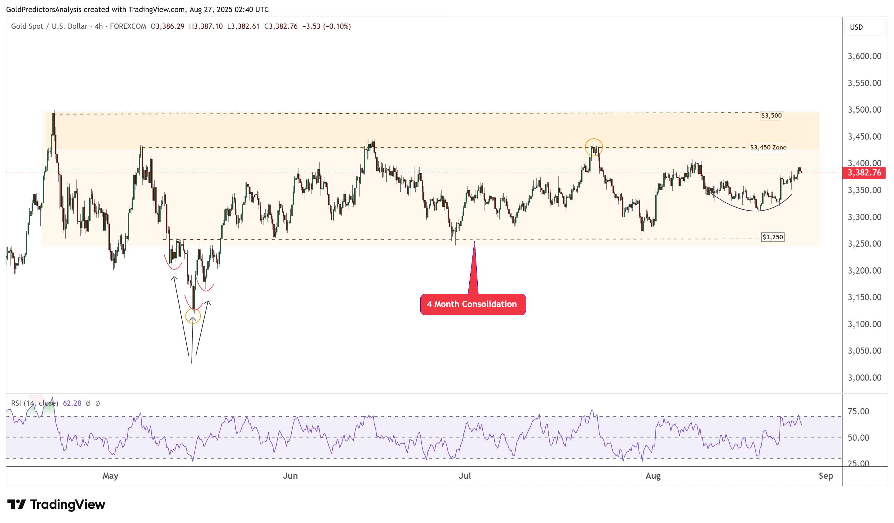 Trên khung 4 giờ, vàng tiếp tục dao động trong biên độ $3,250 – $3,450 nhưng vẫn giữ cấu trúc tăng giá. Điều này cho thấy rủi ro điều chỉnh giảm là hạn chế và xu hướng bứt phá tăng vẫn chiếm ưu thế.