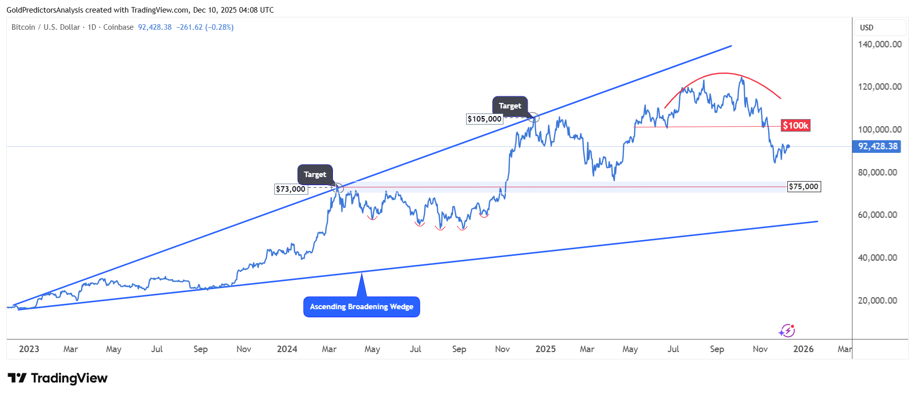 Như biểu đồ thể hiện, Bitcoin hình thành đỉnh tròn trong cấu trúc nêm mở rộng tăng quanh 120,000 USD. Sau đó, giá phá vỡ hỗ trợ quan trọng 100,000 USD và tiếp tục suy yếu.