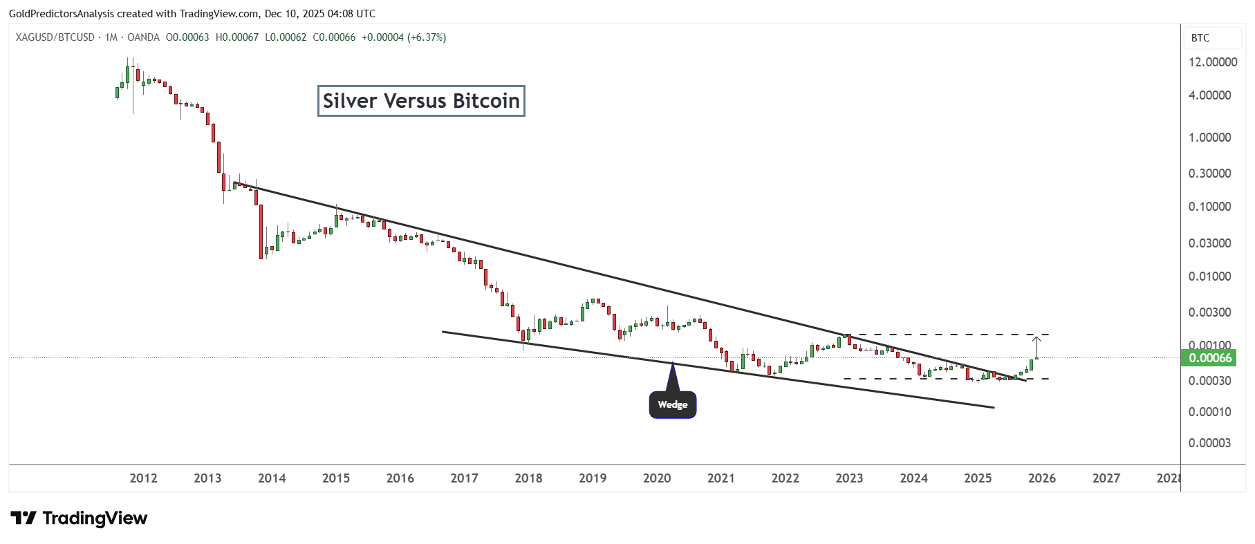 Biểu đồ cho thấy tỷ lệ bạc trên Bitcoin bứt phá khỏi mô hình nêm, một tín hiệu hiếm và mạnh, cho thấy vốn đang rời khỏi thị trường tiền số sang tài sản hữu hình có liên kết với nhu cầu kinh tế thực.