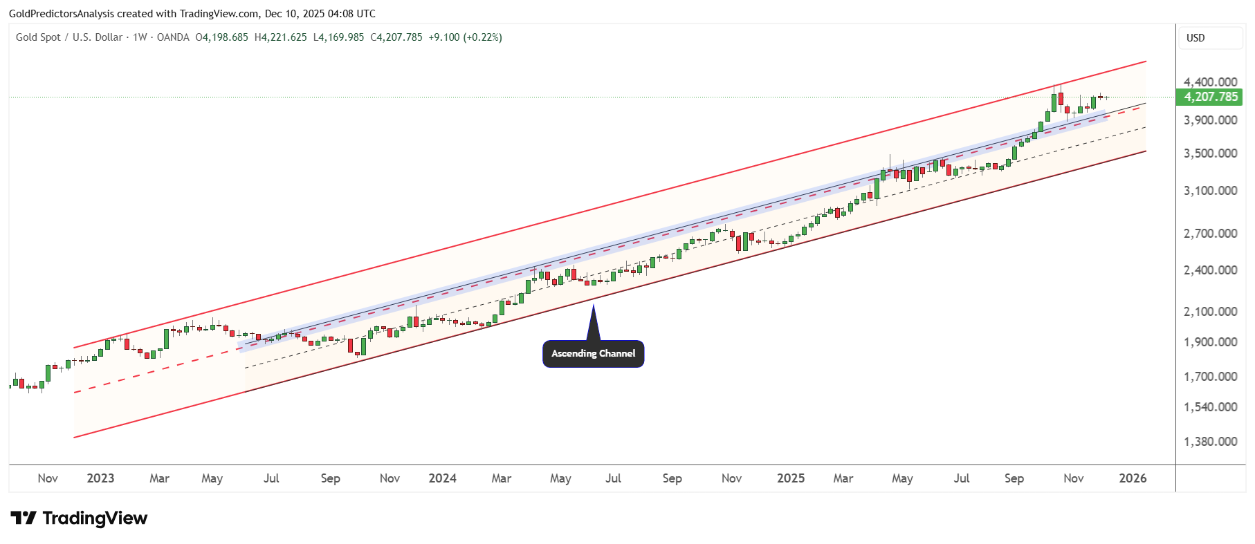 Vàng tiếp tục tích lũy trong cấu trúc tăng rộng. Nhu cầu từ ngân hàng trung ương và lợi suất thực giảm hỗ trợ xu hướng dài hạn. Biểu đồ cho thấy giá duy trì trong khung kênh tăng dần và thiên hướng hướng lên.