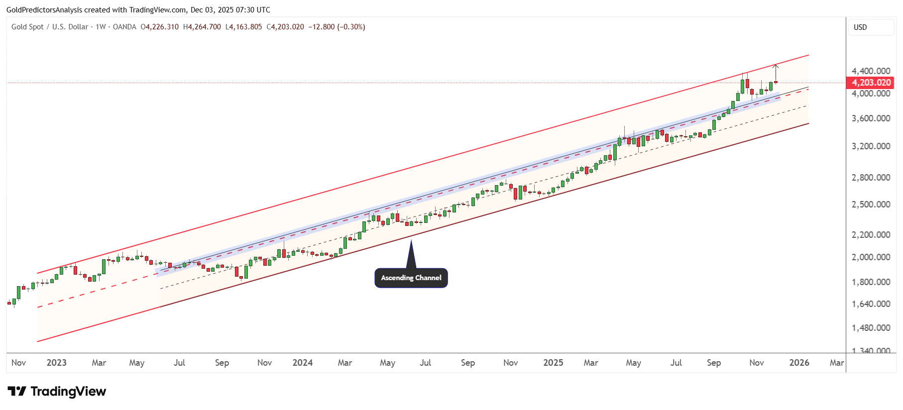 Biểu đồ khung tuần của vàng giao ngay cho thấy giá đang vận động trong kênh tăng và đã hình thành đáy quanh vùng 4,000 USD, trùng với đường giữa kênh. Nhịp phục hồi từ khu vực này phản ánh lực mua mới. Theo cấu trúc hiện tại, vàng có khả năng tiếp tục tiến tới vùng kháng cự phía trên, quanh 4,500 USD.
