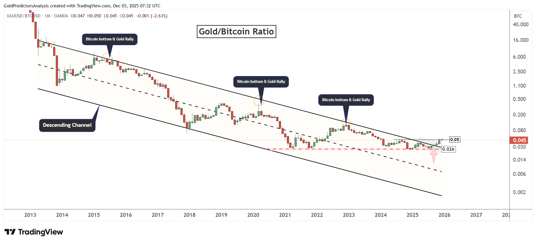 Tỷ lệ vàng/Bitcoin đang điều chỉnh từ mức kháng cự 0.05, trùng thời điểm Bitcoin tìm thấy hỗ trợ quanh 80,000 USD. Mối tương quan này cho thấy BTC có thể đang chuẩn bị phục hồi.