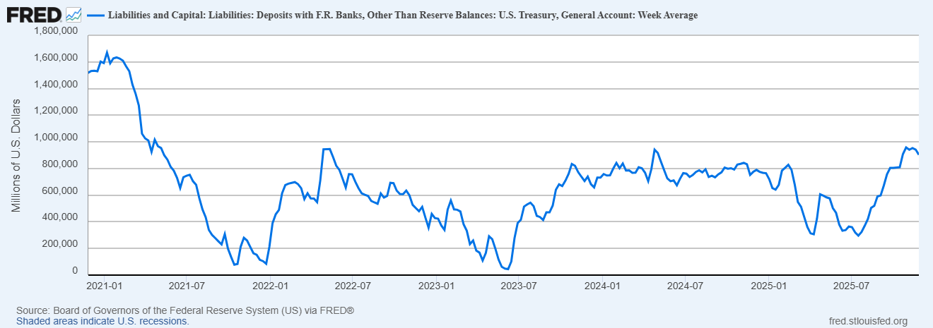 Cùng lúc đó, Tài khoản tổng hợp Kho bạc (TGA) neo ở mức cao, hạn chế dòng vốn bổ sung vào thị trường. Một TGA cao hoạt động như “máy hút”, rút thanh khoản khỏi tài sản rủi ro và làm chậm tín dụng. Điều kiện tài chính hiện tại là chặt chẽ nhất trong hơn một năm.