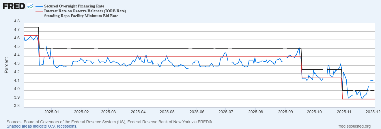 Lãi suất Tài trợ Qua đêm Được bảo đảm (SOFR) đang kiểm tra mức 4.0%, cho thấy áp lực gia tăng trong thị trường repo trị giá 12 nghìn tỷ USD. SOFR đang giao dịch cao hơn lãi suất IORB của Fed, phản ánh tình trạng thiếu hụt thanh khoản mà các ngân hàng thương mại buộc phải bù đắp. Môi trường thắt chặt này đang rút cạn dòng tiền trong hệ thống tài chính.