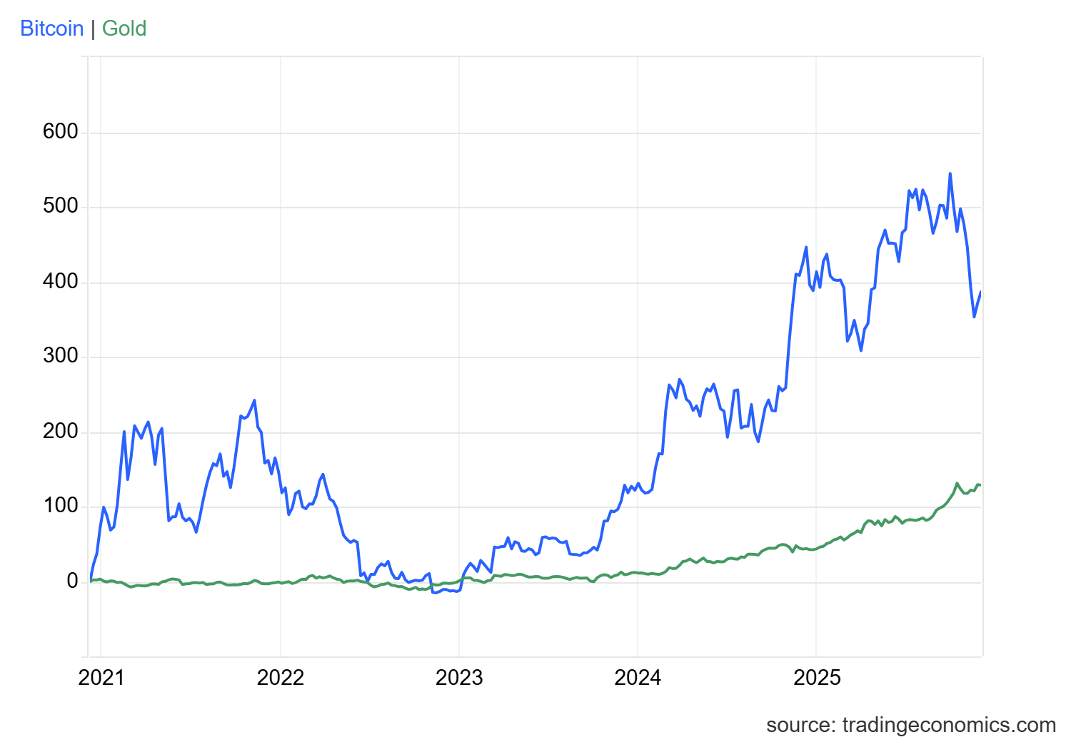 Vàng tiếp tục duy trì sức mạnh trong khi Bitcoin suy yếu, trong bối cảnh thanh khoản thắt chặt, áp lực tài chính gia tăng và dòng vốn rút ra hướng dòng tiền vào kim loại quý thay vì tài sản số trong năm 2025.