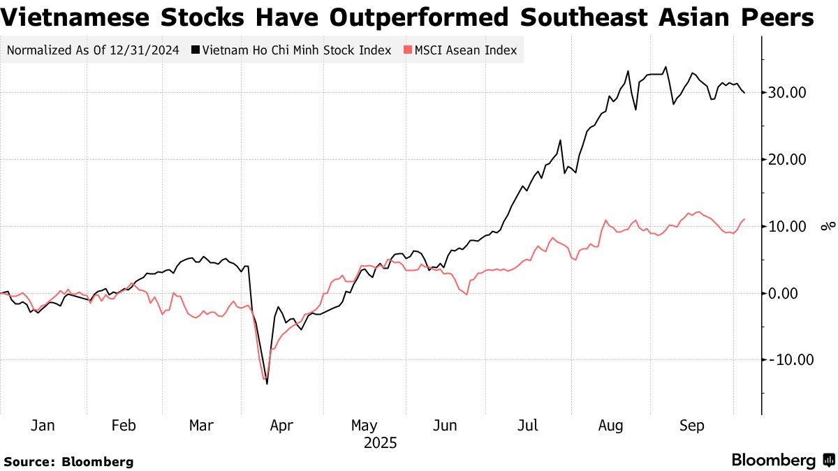 Chỉ số VN Index của Việt Nam đã tăng vọt 30% trong năm nay lên mức cao mới, được thúc đẩy bởi tăng trưởng kinh tế mạnh mẽ và hy vọng về việc nâng cấp. Mặc dù dòng vốn ngoại kỷ lục chảy ra trong tháng Tám, các nhà giao dịch bán lẻ đã thúc đẩy thị trường đạt tháng tốt nhất trong hơn 5 năm.