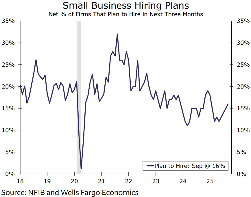 Kế hoạch tuyển dụng của các doanh nghiệp nhỏ tiếp tục tăng nhẹ. Tỷ lệ doanh nghiệp có ý định tuyển dụng trong ba tháng tới tăng lên 16% trong tháng 9, đánh dấu tháng tăng thứ tư liên tiếp. Như biểu đồ cho thấy, kế hoạch tuyển dụng vẫn ở mức thấp so với trung bình những năm gần đây, tuy nhiên mức tăng ổn định trong vài tháng qua cho thấy ý định tuyển dụng của các doanh nghiệp nhỏ đang dần ổn định.