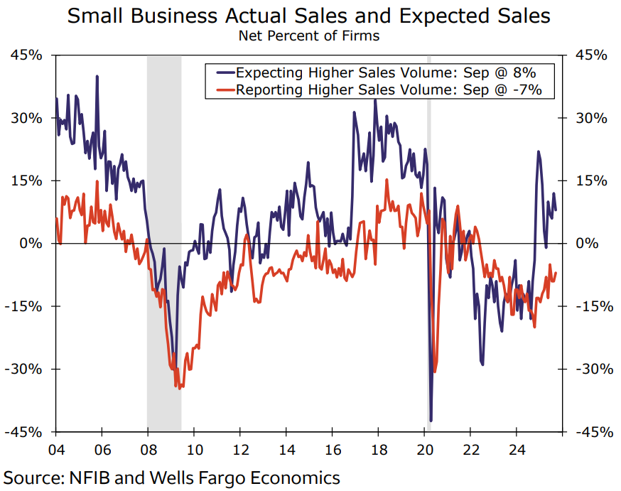 Kỳ vọng về doanh số tương lai, vốn đã cao hơn so với doanh số thực tế trong suốt năm qua, giảm nhẹ trong tháng 9. Tuy nhiên, mức kỳ vọng hiện tại vẫn cho thấy các doanh nghiệp nhỏ tiếp tục tin tưởng vào khả năng tăng trưởng doanh số trong thời gian tới.