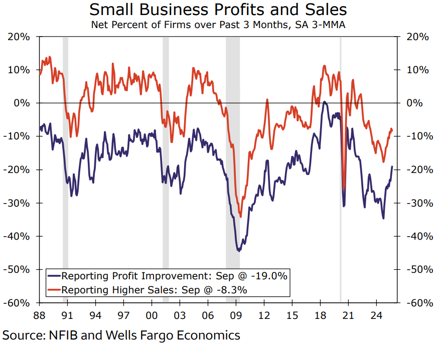 Lợi nhuận của doanh nghiệp nhỏ tiếp tục có dấu hiệu cải thiện. Dù cả lợi nhuận và doanh số vẫn thấp hơn mức trung bình lịch sử, tỷ lệ doanh nghiệp báo cáo tăng lợi nhuận và doanh số đã lần lượt tăng 3 và 2 điểm phần trăm trong tháng 9. Xu hướng đi lên gần đây cho thấy hoạt động kinh doanh vẫn duy trì được sức bền, bất chấp những thách thức từ thay đổi chính sách kinh tế, mức độ bất định tăng và môi trường lãi suất cũng như lạm phát cao.