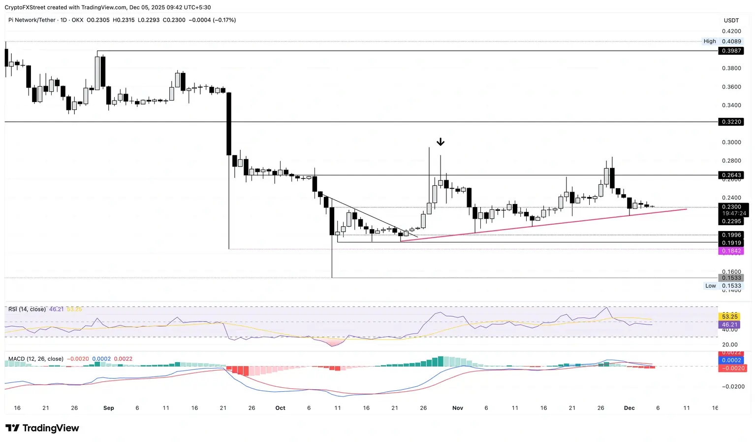 Pi Network (PI) giảm giá vào thứ Sáu trong ngày thứ ba liên tiếp, tiến gần đến đường xu hướng hỗ trợ cục bộ. Dữ liệu on-chain cho thấy áp lực cung tăng lên khi các Sàn Giao dịch Tập trung (CEXs) ghi nhận dòng tiền rút ra tăng mạnh. Về mặt kỹ thuật, đợt điều chỉnh của PI có nguy cơ tiếp tục giảm sâu hơn, khi chỉ báo Moving Average Convergence Divergence (MACD) đang phát tín hiệu bán.